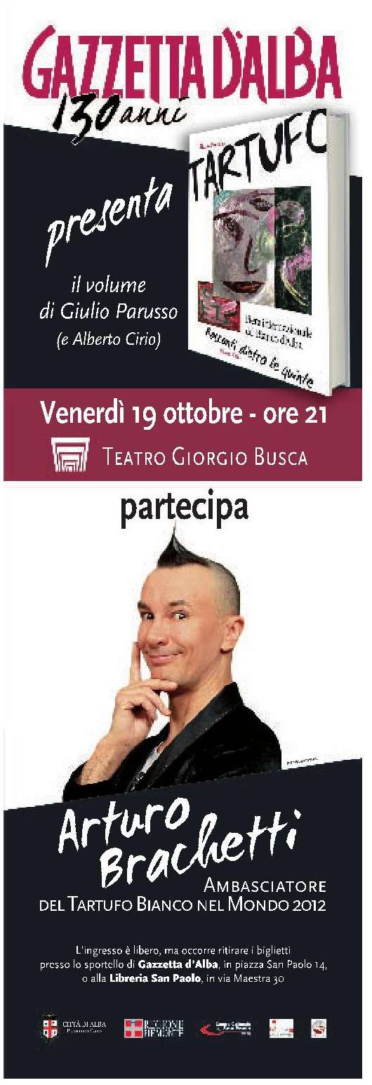 Il volume Tartufo. Fiera internazionale del Bianco d’Alba sarà presentato venerdì 19 ottobre, alle 21, nella sala Abbado del teatro Giorgio Busca di Alba. L’ospite d’onore della serata sarà l’attore e trasformista di fama internazionale Arturo Brachetti. Interverranno il direttore generale dell’Apostolato San Paolo Giusto Truglia, il giornalista di Famiglia Cristiana Francesco Anfossi, il direttore di Gazzetta d’Alba Antonio Rizzolo e gli autori, lo storico Giulio Parusso e Alberto Cirio assessore al turismo del Piemonte. Luigi Barbero, presidente dell’Atl Alba, Bra Langhe e Roero, presenterà lo spot realizzato, con Brachetti, anche ad Alba, per promuovere nel mondo l’immagine turistica del Piemonte. Poi, i riflettori si accenderanno completamente sul grande trasformista, al quale, in chiusura, il Presidente dell’Ente fiera consegnerà il titolo di “Ambasciatore del tartufo nel mondo”.