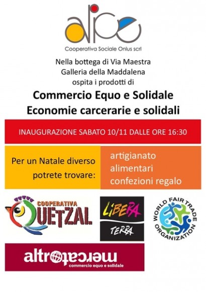 Alice e Quetzal inaugurano la bottega di via Maestra, all’interno della galleria della Maddalena. Inizia nel fine settimana la collaborazione tra le due cooperativa e all’interno del negozio saranno in vendita i prodotti artigianali della cooperativa Alice e del commercio equo di Quetzal. Siete tutti invitati sabato 10 novembre dalle 16.30 alla bottega in via Vittorio Emanuele 19, ad Alba.