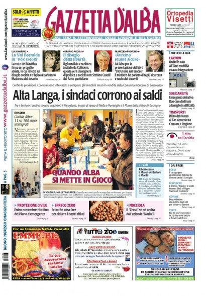 La copertina del 13 novembre 12 Novembre 2012 Alba Versione accessibile In anteprima la copertina di Gazzetta d’Alba che sarà in edicola domani, 13 novembre 2012. Copertinaprima pagina