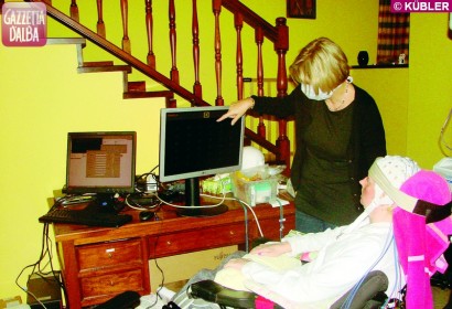 Entriamo: ci accoglie il padre di Daniela. Dobbiamo intervistare la psicologa e biologa Andrea Kübler, ricercatrice di fama mondiale, che nel salotto dell’abitazione sta armeggiando con macchinari e computer, fogli e calcoli tecnici. È aiutata da due giovani ricercatori. Arrivano dalla Germania, sono a Bra da tre giorni. Sulla sedia a rotelle, Daniela non può parlare o muoversi, può solo battere le palpebre. Ha alcuni elettrodi su un casco appoggiato in testa; siede di fronte a uno schermo che si illumina a intermittenza Attraverso il metodo chiamato Brain computer interface, gli scienziati tentano di scovare una strategia per facilitare la comunicazione tra il mondo interno di Daniela e l’esterno.