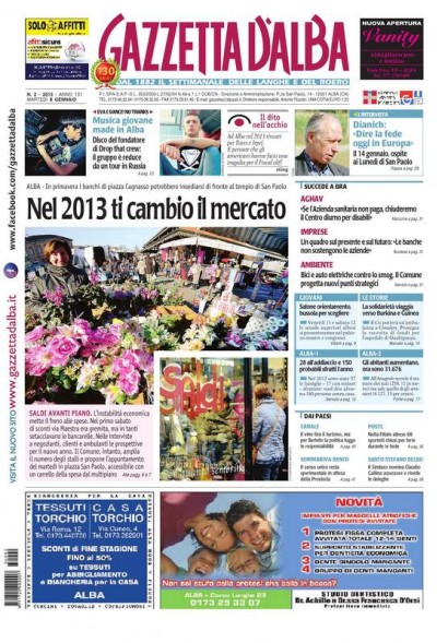 La copertina dell’8 gennaio 7 Gennaio 2013 Alba Versione accessibile In anteprima la copertina di Gazzetta d’Alba che sarà in edicola domani, 8 gennaio 2013. Copertinaprima pagina