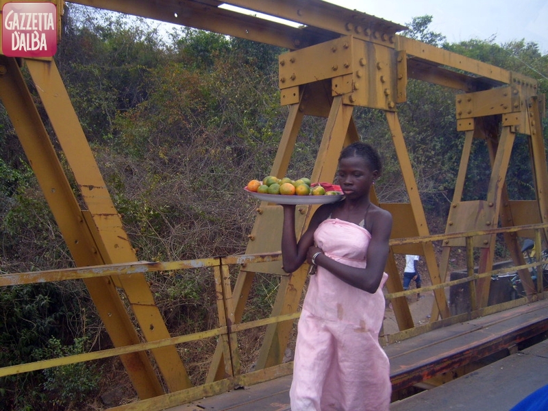 Non di rado incontriamo ragazzine che vendono frutta che noi comperiamo. In un villaggio dobbiamo caricare numerose taniche di benzina e altro materiale per aiutare un tizio amico del funzionario di dogana il cui mezzo si è bloccato nel mezzo della foresta. In tutti i villaggi che incontriamo, non molti per la verità, siamo salutati con simpatia da tutti.