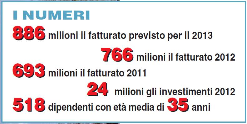 «Il fatturato è salito dai 693 milioni di euro del 2011 a 766 milioni dell’anno passato. Per il 2013 si prevede un’ulteriore crescita a 886 milioni. Gli investimenti sono ammontati a circa 24 milioni, in aumento rispetto ai 21 investiti nel 2011».