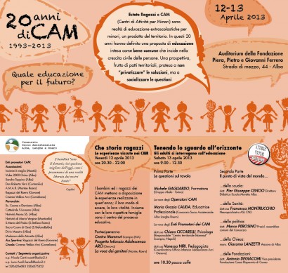 ALBA. Yes, we Cam! Parafrasando il noto slogan statunitense, il Consorzio socio-assistenziale domani, venerdì 12, e sabato 13 aprile proporrà due incontri per celebrare i 20 anni dei Cam, Centri attività per minori. Di seguito proponiamo il programma completo delle iniziative. Cliccate sull’immagine per ingrandire il volantino.