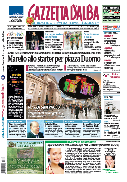 La copertina del 14 maggio 13 Maggio 2013 Alba Versione accessibile In anteprima la copertina di Gazzetta d’Alba che sarà in edicola domani, martedì 14 maggio 2013. CopertinaGazzetta d'AlbaMaurizio Marelloprima pagina