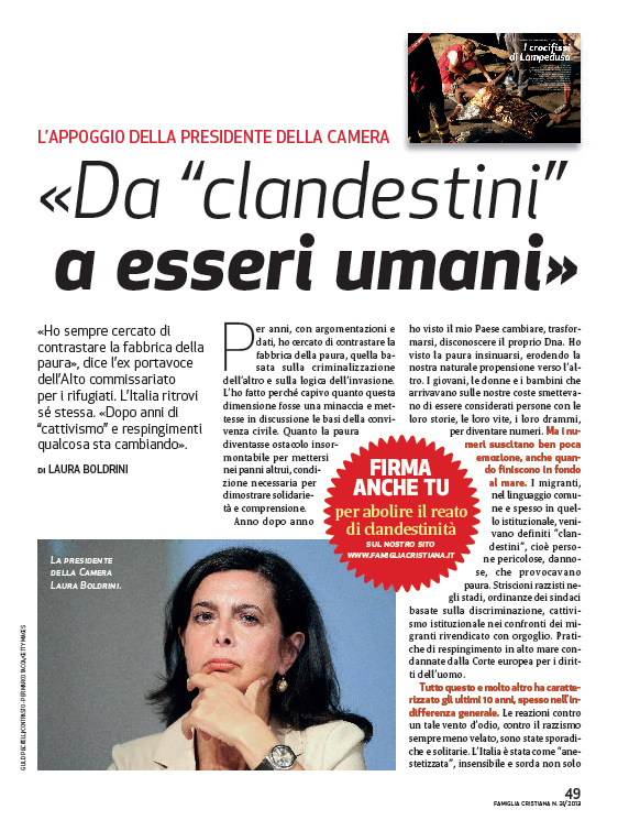 MILANO Famiglia Cristiana in edicola questa settimana pubblica l’articolato testo di Laura Boldrini sulla questione del reato di clandestinità. «L’Italia è stata come “anestetizzata”, insensibile e sorda non solo a chi chiedeva aiuto ma anche a chi reclamava solo il rispetto dei propri diritti», scrive il Presidente della Camera, «E purtroppo questo atteggiamento è stato trasversale, ha toccato – seppure con sfumature diverse – la gran parte delle forze politiche».