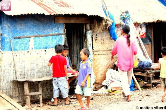 La madre è sorridente, donna corpulenta e sicura di sé. La casa cade a pezzi: un pertugio di quattro metri per quattro, lamiera e paglia assemblate su un torrente di acqua sporca, probabilmente fognature. Condizioni igienico-sanitarie disastrose. Colpisce ciò che vediamo sulle scale del soppalco: “appollaiati” sui gradini stanno sei bambini immobili, uno in fila all’altro. Ci scrutano con occhi inespressivi. Più simili a bambole che a esseri umani. Parlando con la famiglia scopriamo che tra genitori e figli sussiste un clima d’amore. Le condizioni materiali preoccupano, ma si respira allegria. Ci sediamo su uno sporco tavolo di metallo. Scambiamo storie, esperienze. Nim sembra contento della visita, pure i suoi genitori.