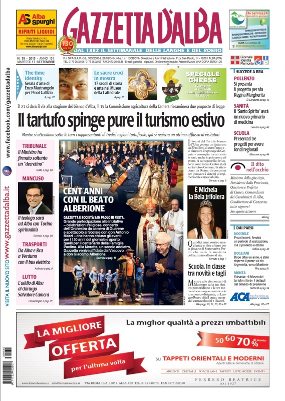 ANTEPRIMA. La copertina di martedì 17 settembre 16 Settembre 2013 Alba, Primo Piano Versione accessibile In anteprima la copertina del numero 35 di Gazzetta d’Alba, in edicola a partire da martedì 17 settembre 2013. Copertinaprima pagina