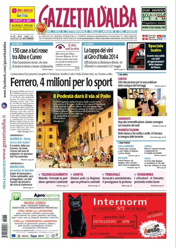 ANTEPRIMA. La copertina di martedì 24 settembre 23 Settembre 2013 Alba, Primo Piano Versione accessibile In anteprima la copertina del numero 36 di Gazzetta d’Alba, in edicola a partire da martedì 24 settembre 2013. Copertina