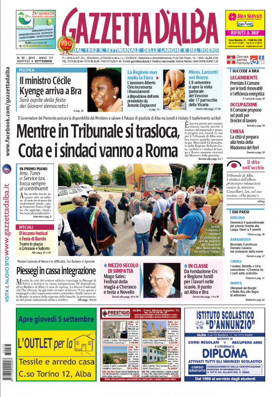 ANTEPRIMA. La copertina di martedì 3 settembre 2 Settembre 2013 Alba, Primo Piano Versione accessibile In anteprima la copertina del numero 33 di Gazzetta d’Alba, in edicola a partire da martedì 3 settembre 2013. Copertinaprima pagina