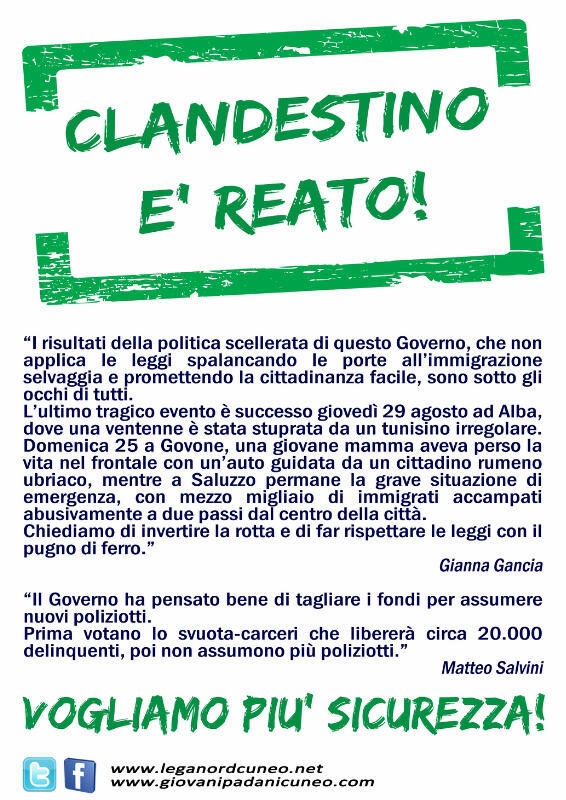 «La Lega Nord – aggiungono Federico Gregorio, consigliere regionale e Flavio Gastaldi del Movimento giovani padani Cuneo – durante i suoi anni di Governo a Roma ha fatto tanto per combattere il reato di immigrazione clandestina e la Legge Bossi-Fini rappresenta esempio lampante di tale attivismo. Ora pare assurdo che ci sia chi voglia abolire tali utili norme, che anzi dovrebbero essere ulteriormente rafforzate».