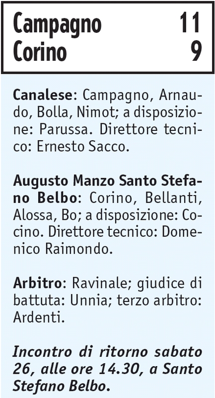 Il risultato premia di misura i padroni di casa, complessivamente più concreti dei rivali (quattro giochi vinti sul 40 pari in una sfida così combattuta pesano molto), ma la prestazione offerta su un campo quest’anno quasi inviolato (Campagno in casa ha perso solo una partita, con Vacchetto nel girone finale) lascia a Corino e soci parecchie chance di riscatto nell’incontro di ritorno in programma sabato a Santo Stefano Belbo.