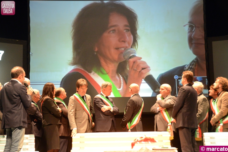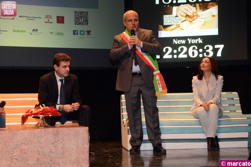 C’era un sindaco Maurizio Marello gonfio di energia. «Dato che ho la pancia, meglio alzarsi in piedi», ha esordito con autoironia abbandonando la panchina sul palcoscenico. Animato da nuova forza, antagonista rispetto a un governo che ha privato la città del suo Tribunale, il primo cittadino ha detto: «Non me la sono sentita di invitare ministri, di assistere a una passerella vista e rivista, a promesse che non verranno mantenute. Siamo andati a Roma, con unione e ostinazione. Non abbiamo ottenuto quello che volevamo, ma abbiamo dimostrato di essere forti». Infine, un atto di cortesia verso i sindaci dei comuni circostanti: «A dispetto del suo nome, la Fiera del tartufo non è di Alba, non appartiene alla città, ma a tutto il territorio delle Langhe e del Roero». Sul palco appare il presidente della fondazione Cassa di risparmio di Cuneo Ezio Falco: si ironizza sul suo cognome, sul suo ruolo di “falco” che dall’alto “controlla” la comunità locale.