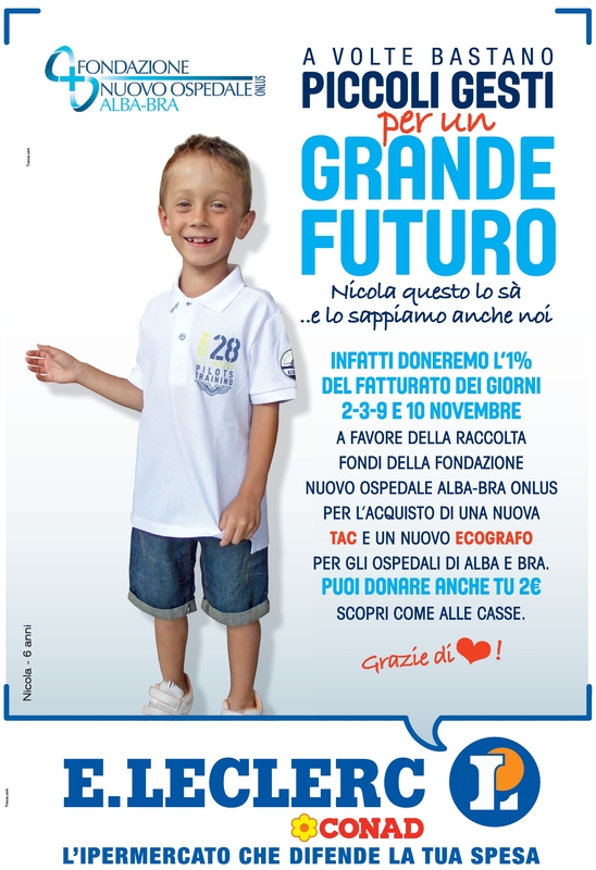 ALBA L’ipermercato E.Leclerc di corso Asti ad Alba abbraccia l’iniziativa lanciata dalla Fondazione nuovo ospedale Alba-Bra per raccogliere fondi in modo da acquistare un nuova tac per l’ospedale di Alba e un nuovo ecografo per quello di Bra, che verranno poi trasferiti a Verduno, una volta che la nuova struttura sarà completata.