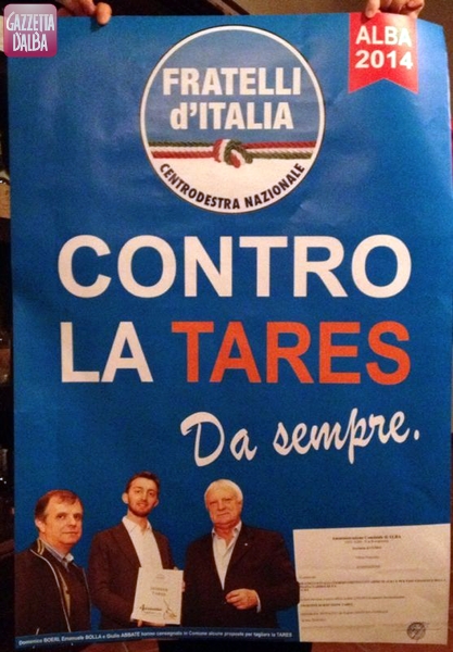 ALBA Prosegue la marcia di avvicinamento di Fratelli d’Italia alle elezioni comunali del 2014. Nella mattinata di oggi, venerdì 18 ottobre, la sezione albese del partito guidato da Guido Crosetto ha affisso in città dei manifesti su cui campeggia lo slogan “Contro la Tares, da sempre”. La “faccia” è quella del coordinatore Emanuele Bolla e dei colleghi di partito Domenico Boeri e Giulio Abbate, i quali nei mesi scorsi avevano presentato all’Amministrazione di Maurizio Marello una serie di proposte per rendere meno pesanti gli aumenti portati dalla Tares, la nuova tassa sui rifiuti che ha preso il posto della Tarsu.