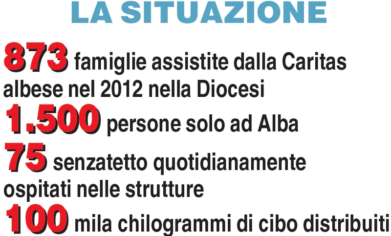 Secondo gli ultimi dati della Caritas, nel 2012 sono state 2.531 le persone sul territorio diocesano di Alba ad aver usufruito dei servizi di carità. In tutto 837 famiglie, il 62 per cento delle quali residenti nel territorio urbano. Significa che circa 1.500 persone nella sola città di Alba (il 5 per cento della popolazione) si sono rivolte in un anno agli uffici parrocchiali per ricevere soccorso nel pagamento delle bollette, nell’acquisto del cibo (sono stati distribuiti 100 mila chilogrammi di alimenti) o beni di prima necessità. A questa cifra bisogna aggiungere i 75 senzatetto, che ogni giorno ricevono riparo e un pasto nelle quattro strutture di accoglienza. Sebbene non sia possibile “disaccorpare” i dati, distinguendo l’utenza bisognosa di cibo da quella bisognosa di aiuto economico, si tratta di statistiche indicative di come l’impossibilità di fronteggiare i bisogni basilari risulti in drastica espansione anche ad Alba. Si tratta perlopiù di immigrati (almeno il 75 per cento), ma anche gli italiani partecipano al dramma. Spiegano dagli uffici Caritas: «A fronte di un incremento della domanda, registriamo un decremento dell’offerta. I privati donano minori quantità di beni di prima necessità. La “colpa” è da attribuire alla recessione economica e all’assenza di sovrapproduzione industriale. Per andare incontro ai bisogni siamo sovente costretti ad attingere alle nostre risorse economiche».