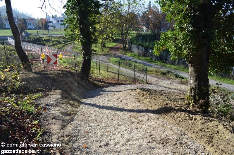 L’intervento, che risulta essere stato effettuato puntualmente nella mattinata di mercoledì 6 novembre a opera di alcuni operai incaricati dal Comune di Alba, è consistito nella realizzazione di una discesa di collegamento tra il percorso interrotto e quello sottostante.