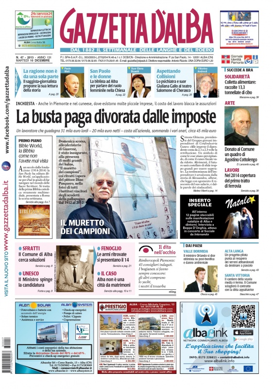 ANTEPRIMA. La copertina di martedì 10 dicembre 9 Dicembre 2013 Alba, Primo Piano Versione accessibile In anteprima la copertina del numero 47 di Gazzetta d’Alba, in edicola a partire da martedì 10 dicembre 2013. Copertina