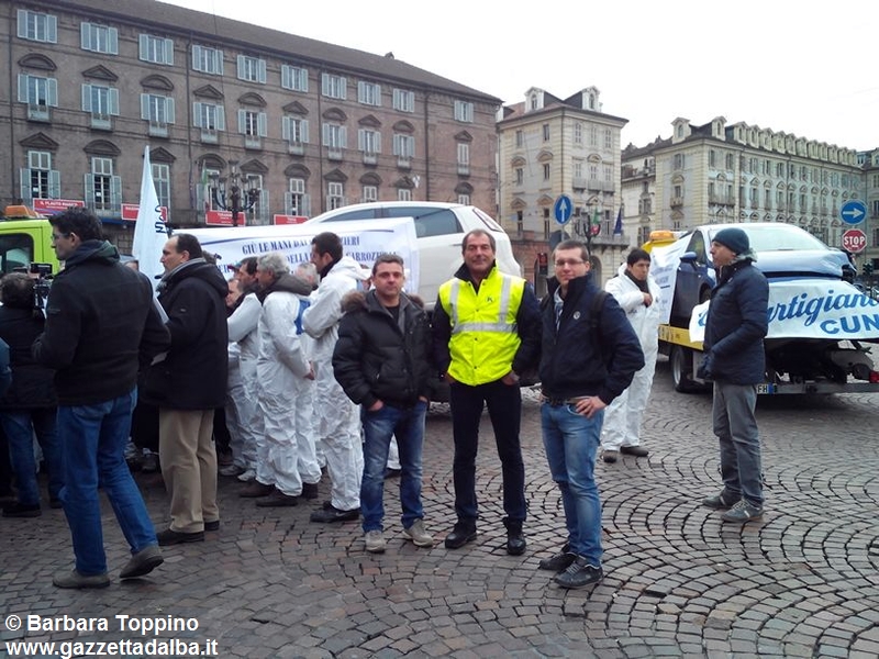 TORINO Prosegue la protesta dei carrozzieri, i quali contestano le norme della riforma dell’Rc auto (contenute nel decreto “Destinazione Italia”, entrato in vigore lo scorso 24 dicembre) che di fatto impongono agli automobilisti rimasti vittima di incidenti di far riparare il proprio veicolo danneggiato esclusivamente presso le officine convenzionate con le assicurazioni. Secondo quanto riporta l’Ansa, in Piemonte la riforma potrebbe causare la chiusura di 2.000 imprese di carrozzeria, che in tutto contano oltre 5.000 addetti. Dopo aver partecipato alla manifestazione nazionale organizzata il 15 gennaio a Roma, gli autoriparatori cuneesi, nella giornata di lunedì 20 gennaio, sono scesi in piazza a Torino insieme ai rappresentanti di Confartigianato, manifestando in tuta da lavoro davanti alla Prefettura e parcheggiando in piazza Castello diversi automezzi per il soccorso stradale con su esposti cartelli riportanti lo slogan “Giù le mani dai carrozzieri”. Presenti, come mostra la foto, anche gli autoriparatori albesi. Una delegazione è stata ricevuta dal Prefetto.