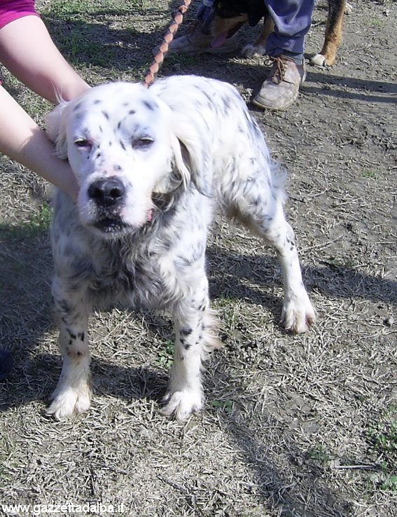 Olimpo: setter di circa otto anni, molto bello e in forma anche se non più giovanissimo. È dolcissimo e obbediente come tutti i cani da caccia. È giunto in canile circa un anno fa insieme a un altro cane della stessa razza, probabilmente era il fratello che è stato adottato. Come spesso accade ai cani della sua razza, se non sono sufficientemente bravi a cacciare oppure sono considerati ormai “vecchi”, vengono abbandonati perché non servono più.
