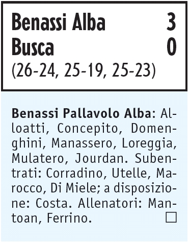 Albesi che nel secondo set non si concedono distrazioni e passano a condurre 5-1, prima e 8-6, dopo, con due attacchi vincenti ancora di Domenghini. Sull’11-8 il tecnico locale getta nella mischia Corradino e Utelle per Concepito e Alloatti e il Benassi prende il largo grazie a due attacchi vincenti di Loreggia e Domenghini che portano i padroni di casa sul 18-12. Nel finale rientra Concepito in tempo per siglare il punto, con uno splendido pallonetto, del 24-19, prima del muro vincente di Loreggia per un 25-19 largo e meritato. Nel terzo set ancora sugli scudi Manassero e Domenghini vere e proprie anime di questa squadra che si sta rivelando formidabile. Il Benassi si porta subito avanti 6-3 arrivando al primo time out tecnico sull’8-4. Un vantaggio mantenuto fino al 14-10 quando si assiste al secondo momento nero degli albesi che permette la rimonta e il sorpasso di Busca, che con un parziale di 0-7 passa a condurre 14-17. Sotto di tre punti la formazione albese tira fuori tutto il carattere, pareggia i conti sul 18-18 e passa nuovamente in vantaggio 23-20 con un muro di Mulatero, due attacchi punto di Manassero e un ace di Alloatti. La palla della partita la mette a terra Domenghini che suggella il 25-23 che regala altri tre punti e la vetta solitaria della classifica a più 2 su Chieri e più 5 sul Saronno.