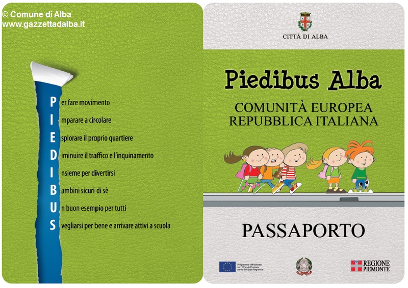 ALBA Giovedì 13 marzo il sindaco di Alba Maurizio Marello e l’assessore all’istruzione Luigi Garassino consegneranno ai dirigenti scolastici di ogni plesso scolastico della città i “Passaporti Piedibus”. Ecco il programma: scuola elementare di Mussotto alle 9, scuola elementare “Coppino” alle 9.30, scuola elementare “Sacco” alle 10 e scuola elementare “Rodari” alle 10.30. Si tratta di un libretto simile a un passaporto, spiegano dal Comune, che contiene la foto dello studente, i dati anagrafici, diversi giochi educativi sull’ambiente, le istruzioni e le regole di comportamento relative al Piedibus e una pagina sulla quale verranno apposti i timbri con il logo dell’iniziativa di mobilità sostenibile.