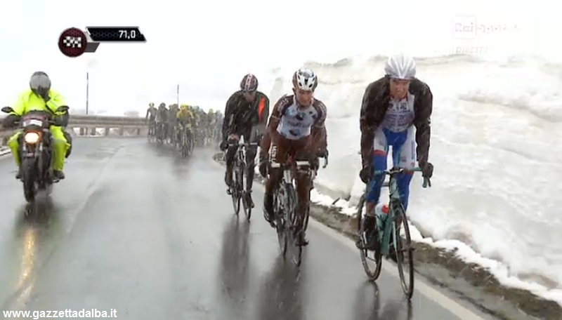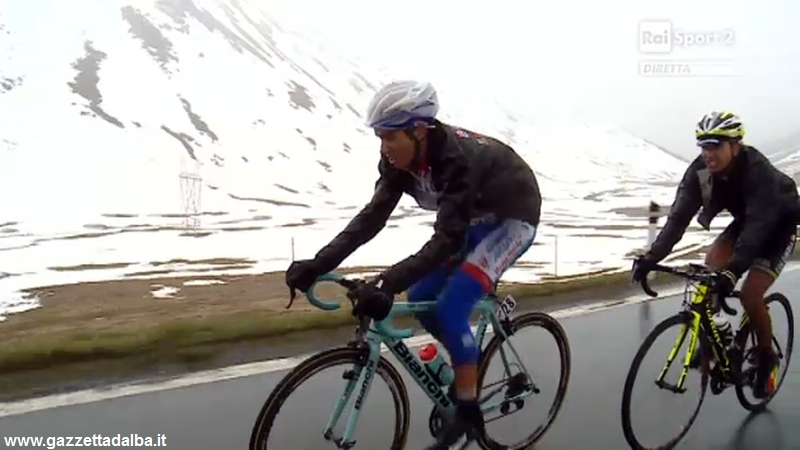 CICLISMO Giornata all’attacco per lo scalatore albese dell’Androni Giocattoli-Venezuela Diego Rosa che, nonostante il dolore alla gamba infortunata e le condizioni climatiche estreme (pioggia, neve e grande freddo), ha infiammato la sedicesima tappa della corsa rosa, la più impegnativa dell’edizione 2014, scattando con coraggio insieme al proprio capitano Franco Pellizotti sul passo Gavia e pedalando nelle posizioni di testa anche sulle rampe dello Stelvio.