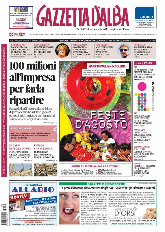 ANTEPRIMA. Le copertine di Gazzetta d’Alba del 5 agosto 2014 4 Agosto 2014 Alba, Primo Piano Versione accessibile La copertina del numero 31 di Gazzetta d’Alba e la sovracopertina dedicata ai 100 anni della Società San Paolo (fondata nel 1914 ad Alba dal beato Giacomo Alberione), disponibili in edicola e in formato digitale a partire da martedì 5 agosto 2014. AlbaanteprimaCopertinaSan Paolo