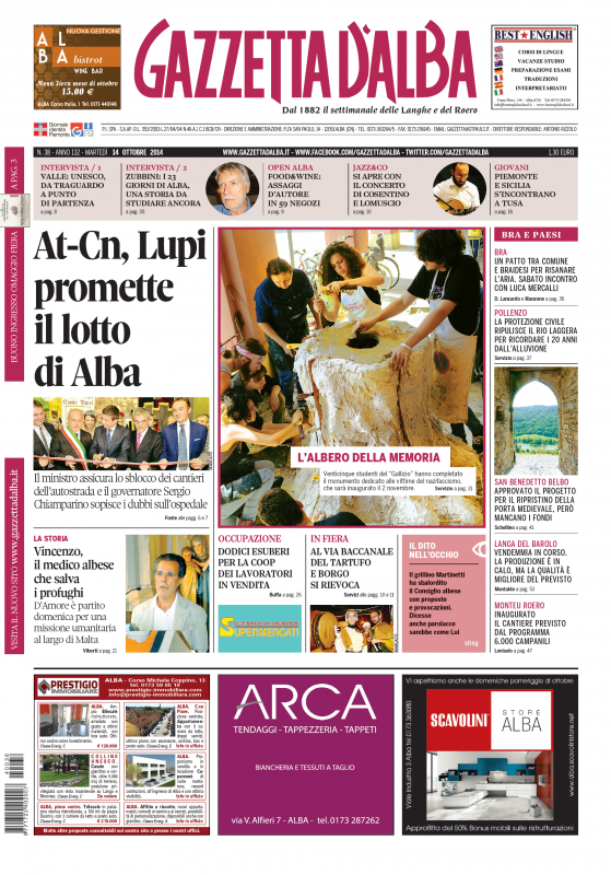 La copertina di Gazzetta d’Alba del 14 ottobre 2014 13 Ottobre 2014 Alba, Primo Piano Versione accessibile La copertina del numero 38 di Gazzetta d’Alba, disponibile in edicola e in formato digitale a partire da martedì 14 ottobre 2014. anteprimaCopertina