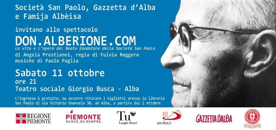 ALBA Don.Alberione.com è il titolo dello spettacolo che verrà rappresentato al teatro sociale “Giorgio Busca” di Alba l’11 ottobre alle 21, a ingresso libero, in piena Fiera internazionale del tartufo bianco d’Alba, per la prima volta “benedetta” dall’Unesco, che ha riconosciuto i paesaggi del vino di Langhe, Roero e Monferrato come patrimonio dell’umanità.