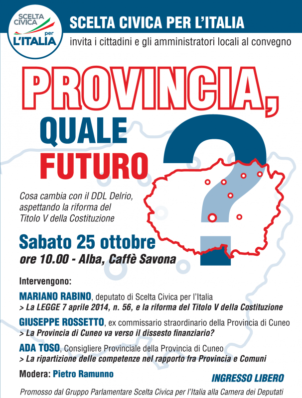 ALBA A due settimane di distanza dal voto per il rinnovo del Presidente e del Consiglio provinciale, ad Alba, si fa il punto della situazione sull’ente ora guidato dal sindaco di Cuneo, Federico Borgna. “Provincia, quale futuro?” è il titolo del convegno – promosso dal gruppo parlamentare Scelta civica per l’Italia alla Camera dei Deputati – organizzato per sabato 25 ottobre presso il Caffè Savona di Alba, a partire dalle 10. Nell’occasione, cui sono invitati tutti i cittadini e gli amministratori locali, si dibatterà sui cambiamenti introdotti dal decreto Delrio, aspettando la riforma del Titolo V della Costituzione.