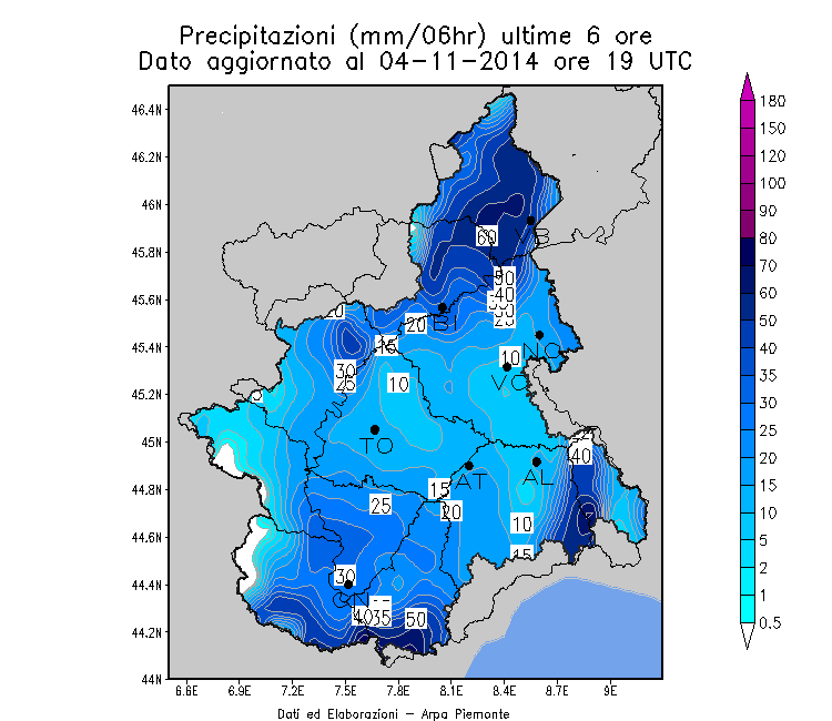 Quando sono passate da poco le 21 di martedì 4 novembre piove diffusamente su tutta la regione con picchi più intensi sul settore meridionale associati al passaggio di celle temporalesche in formazione sul mare e in transito verso l’entroterra. Anche sulle zone settentrionali le precipitazioni sono state molto intense in particolare tra la provincia di Biella e Verbania. Sopra i 2000 metri si sono registrati fino a 50 cm di neve fresca.