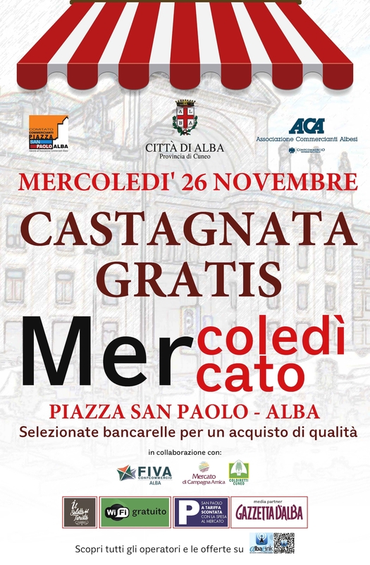 ALBA In attesa dell’offerta commerciale per il Natale gli ambulanti del mercato settimanale di piazza San Paolo hanno predisposto una calorosa accoglienza per la clientela e i frequentatori dell’appuntamento di mercoledì 26 novembre. Fumanti caldarroste saranno offerte dagli esercenti, sia come pensiero di gratitudine rivolto a chi, fedelmente, ormai dallo scorso marzo, frequenta i banchi di piazza San Paolo, sia ai bambini, alle famiglie e a tutti coloro che lo desiderano, come anticipato augurio di “buone cose”.