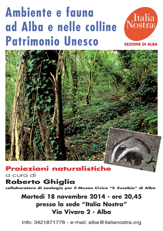 Martedì 18 novembre, alle 20.45, nella sede di Italia nostra (via Vivaro 2, Alba) verrà presentato un filmato curato dalla sezione albese di Italia nostra sui gravi effetti nel 1994 delle esondazioni del torrente Cherasca e del rio Verdero, poi la parola passerà a Roberto Ghiglia, qualificato collaboratore di zoologia al museo civico “Eusebio” di Alba, che presenterà fotografie relative all’ambiente boschivo e ai mammiferi che vivono nell’ambito locale.