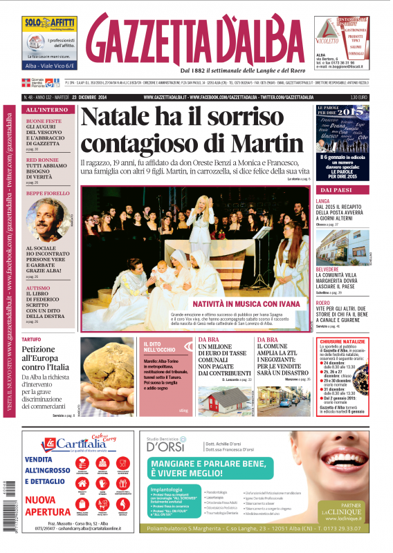 La copertina di Gazzetta d’Alba del 23 dicembre 2014 22 Dicembre 2014 Alba, Primo Piano Versione accessibile La copertina del numero 48 di Gazzetta d’Alba, disponibile in edicola e in formato digitale a partire da martedì 23 dicembre 2014. anteprimaCopertina