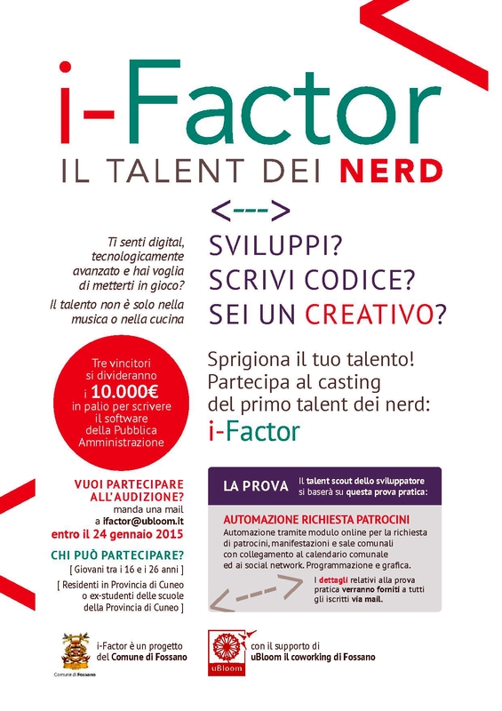 FOSSANO Il Comune di Fossano lancia il concorso i-Factor dedicato ai giovani tra i 16 e i 26 anni. Gli interessati devono iscriversi via e-mail entro il 24 gennaio 2015 a ifactor@ubloom.it. Ai candidati verrà chiesto di realizzare un sistema per automatizzare le richieste di patrocini, manifestazioni e sale comunali, curando programmazione e grafica. La giuria individuerà i tre progetti migliori e affiderà ai vincitori la realizzazione di servizi innovativi per la pubblica amministrazione e premi per 10.000 euro.