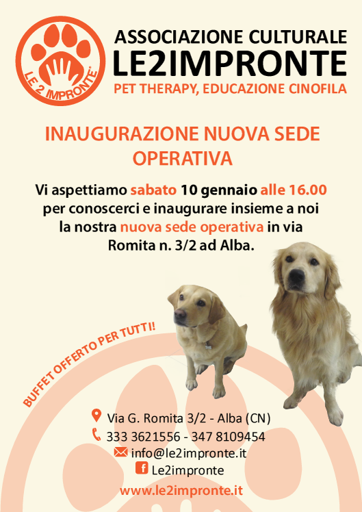 ALBA Sabato 10 gennaio alle 16 verrà inaugurata la nuova sede operativa dell’associazione Le2impronte che si trova in via Romita 3/2. Operatori di pet therapy, educatori cinofili, psicologi e tutti i soci aspettano gli interessati per presentare le attività. In più ci sarà la possibilità di acquistare i biglietti della lotteria de La lampada magica onlus, la cui estrazione avverrà venerdì 6 febbraio.