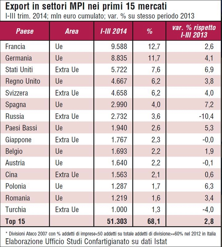 Nei primi nove mesi dell’anno, dal nostro Paese sono partiti, verso l’Europa e non solo, prodotti realizzati da 243.218 piccole imprese per un valore di 75,4 miliardi di euro, con aumento del 3,3 per cento, pari a 2,4 miliardi, rispetto allo stesso periodo del 2013. Le esportazioni delle piccole aziende mostrano un aumento duplicato rispetto all’andamento complessivo dell’export manifatturiero, che ha registrato una crescita dell’1,7 per cento.
