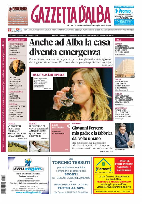 La copertina di Gazzetta d’Alba del 24 febbraio 2015 23 Febbraio 2015 Alba, Primo Piano Versione accessibile La copertina del numero 8 di Gazzetta d’Alba, disponibile in edicola e in formato digitale a partire da martedì 24 febbraio 2015. AlbaanteprimaCopertina
