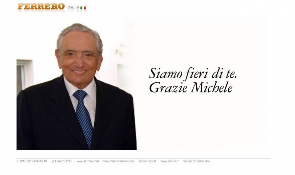 Non so in quanti luoghi del mondo un imprenditore di successo possa vantare di avere attorno a sé una tale stima, un affetto tanto grande. Per noi dipendenti non era l’uomo più ricco d’Italia o il fondatore di un impero del cioccolato, era semplicemente Michele, una persona dalla grande umanità che rispettava tutti ed era rispettato da tutti. Il Michele che parlava poco, ma c’era sempre e quando scriveva ai dipendenti sapeva usare parole dolci come il miele e forti come macigni. Avveniva periodicamente in occasione delle festività natalizie. Fuori il mondo crollava sotto i colpi della crisi, dentro Michele ci augurava «Buon Natale», ringraziandoci, dicendoci che il merito del successo della Ferrero era in gran parte nostro. Ci assicurava sulla solidità di un’azienda che aveva un volto umano, il suo, e invitava a un Natale sereno da vivere in famiglia.