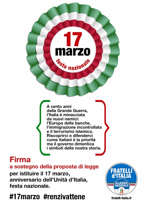 CUNEO Domenica 15 marzo a Cuneo, in corso Nizza all’altezza del numero civico 12 (dalle 9 alle 12.30 circa), la costituente provinciale di Fratelli d’Italia-An organizzerà una postazione fissa per la raccolta firme a sostegno della proposta di legge con l’obiettivo di riconoscere il 17 marzo quale festività nazionale per la celebrazione della proclamazione dell’unità d’Italia, al fine di promuovere e difendere i valori dell’unità e dell’indivisibilità della Repubblica, come solennemente sanciti nella nostra Carta costituzionale.