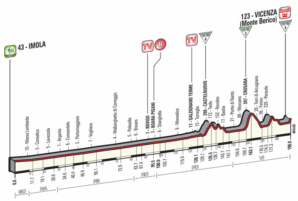 Domani, giovedì 21 maggio, 12.a tappa, 190 km da Imola a Vicenza (Monte Berico). Frazione divisa nettamente in due parti: i primi 130 km assolutamente piatti con l’attraversamento della Pianura Padana e gli ultimi 60 km circa molto mossi e ondulati, caratterizzati da alcune salite molto impegnative e dall’arrivo sullo strappo finale. Si percorre la bassa ferrarese e il Polesine lungo strade pianeggianti, sostanzialmente rettilinee e mediamente di carreggiata normale e a volte usurata. Dopo Torriglia si scala la salita pedalabile di Castelnuovo sui Colli Euganei per attraversare il breve tratto di pianura che separa dai Berici e scalare la salita di Crosara da Mossano con quasi 2 km sopra il 10% e punte del 17% su strada abbastanza larga che immette nella discesa impegnativa di Lapio e negli ultimi impegnativi 15 chilometri.