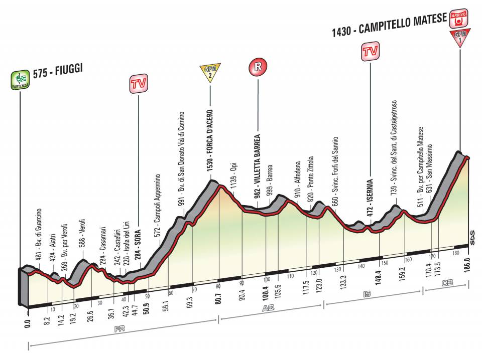 Domani, sabato 16 maggio, ottava tappa: 186 km da Fiuggi a Campitello Matese. Frazione di montagna caratterizzata dalle lunghe salite dei due GPM: Forca d’Acero (quasi 30 km attorno al 4/5%) e Campitello Matese di quasi 16 km attorno al 7%. Dopo la partenza si toccano su strade sostanzialmente pianeggianti Alatri, Veroli e Sora, dove inizia la lunga salita di Forca d’Acero che porta in Abruzzo e in rapida successione (dopo Ponte Zittola) in Molise. Da segnalare la lunga e pedalabile discesa fino a Isernia sulla nuova strada a scorrimento veloce SS17 con alcune gallerie in successione. Dopo Isernia ancora un tratto su strada larga e leggermente vallonata fino alla salita finale di Campitello Matese.