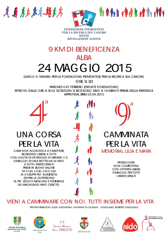 ALBA. Domenica 24 maggio viene riproposta la nona Camminata per la vita, Memorial Lilia e Mara, organizzata dalla Delegazione albese della Fondazione per la ricerca sul cancro di Candiolo Onlus presieduta da Giovanni Porta e patrocinata dal Comune di Alba.