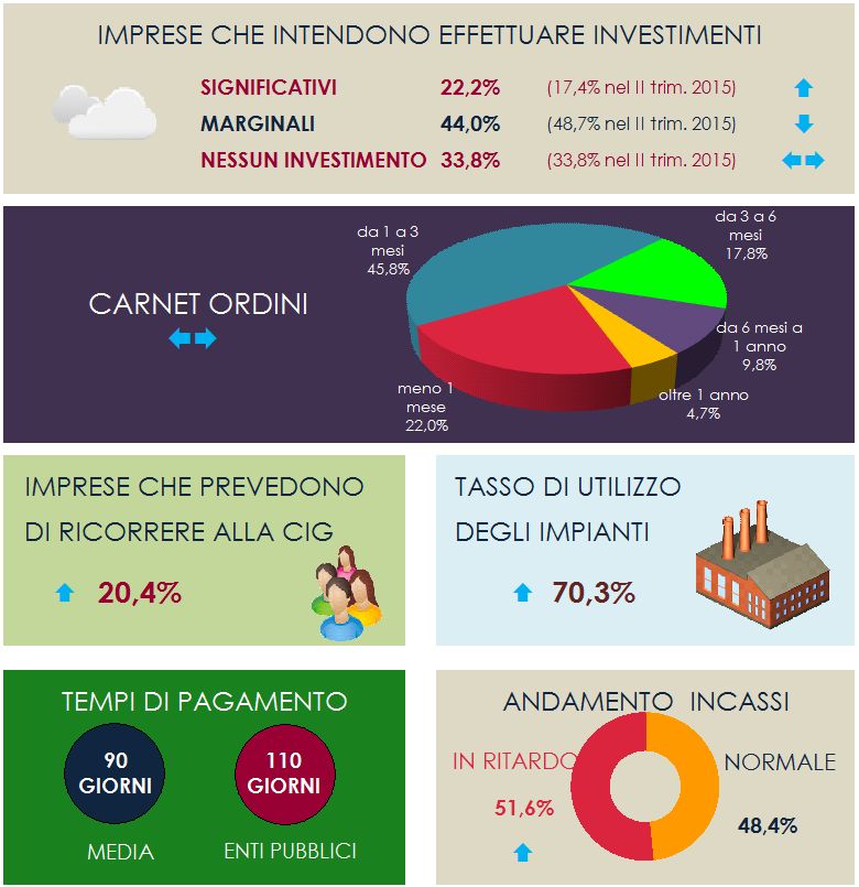 I risultati dell’indagine suggeriscono di mantenere un certo grado di prudenza nelle valutazioni, nelle ultime settimane, infatti, gli elementi di incertezza sono aumentati: dai dubbi sulla evoluzione della crisi greca al rallentamento, ormai strutturale, di alcuni mercati emergenti come il Brasile e la Russia. In Europa la ripresa stenta a prendere velocità, mentre in Italia la domanda interna fatica a decollare costringendo le aziende a muoversi in uno scenario soggetto a continui e repentini mutamenti e a munirsi di una grande capacità di adattamento.
