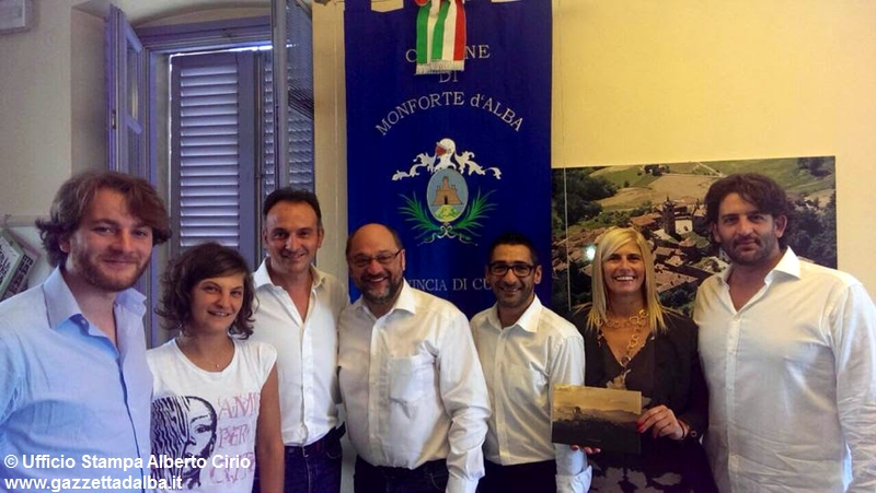 MONFORTE Il presidente del Parlamento europeo, Martin Schulz, sarà in Piemonte nel prossimo autunno per ricevere la cittadinanza onoraria di Monforte d’Alba e partecipare all’inaugurazione dell’85^ Fiera internazionale del Tartufo bianco, in programma ad Alba dal 10 ottobre al 15 novembre 2015: l’annuncio è stato dato proprio a Monforte, dove Schulz, in vacanza in questi giorni nelle Langhe, è stato accolto dall’eurodeputato Alberto Cirio.