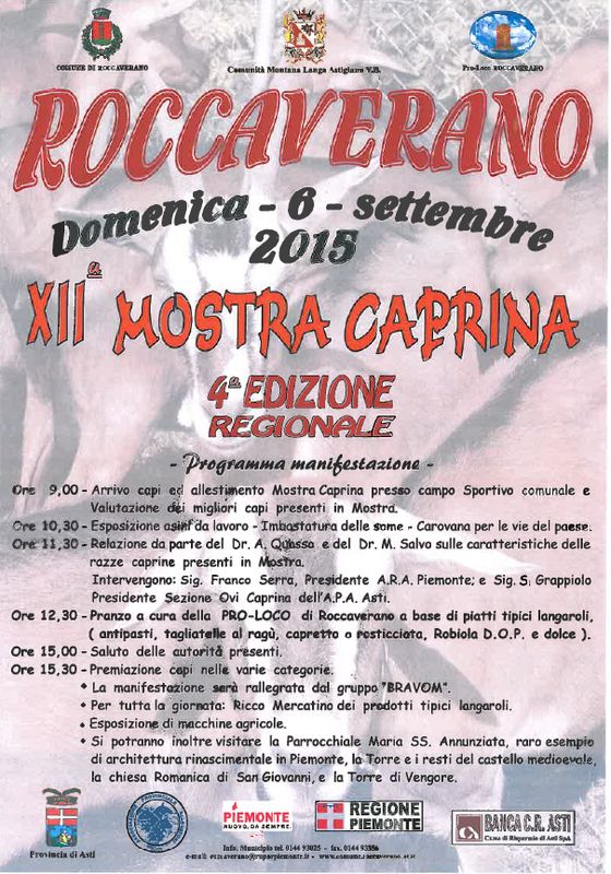 ROCAVERANO Domenica 6 settembre si svolgerà a Roccaverano la tradizionale mostra caprina, antico appuntamento che appartiene a questo paese della Langa astigiana. Esposizione e premiazione dei capi degli allevatori della pregiata razza Roccaverano e poi degustazioni enogastronomiche e distribuzione di prodotti e piatti tipici locali. I partecipanti e i turisti hanno la possibilità di degustare e acquistare le specialità langarole, prima fra tutte la tobiola Dop, visitare la chiesa parrocchiale Bramantesca, la chiesa romanica di San Giovanni e le torri medioevali.