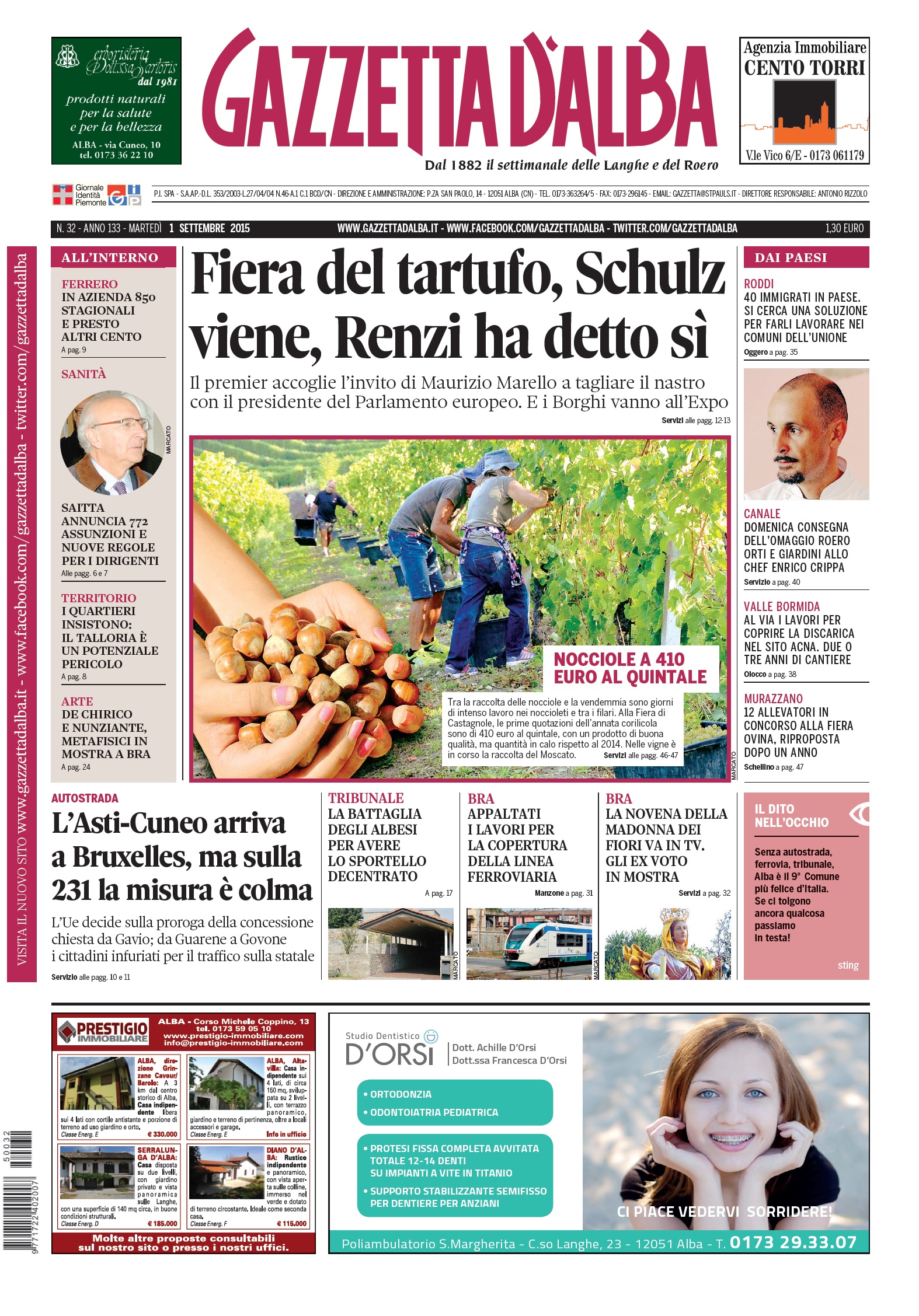 La copertina di Gazzetta d’Alba del 1° settembre 2015 1 Settembre 2015 Alba, Primo Piano Versione accessibile ALBA La copertina del numero 32 di Gazzetta d’Alba, disponibile in edicola e in formato digitale a partire da martedì 1° settembre 2015. anteprimaCopertina