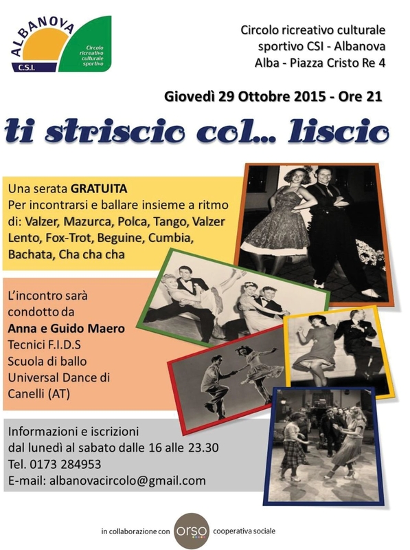 ALBA Giovedì 29 ottobre alle 21, ad Alba, presso il Circolo ricreativo culturale sportivo Csi Albanova -Oratorio parrocchia di Cristo Re in piazza Cristo Re 4 è in programma Ti striscio… col liscio, una serata gratuita per incontrarsi e ballare insieme a ritmo di: valzer, mazurca, polca,tango, valzer lento, fox-trot, beguine, cumbia, bachata, cha cha cha.