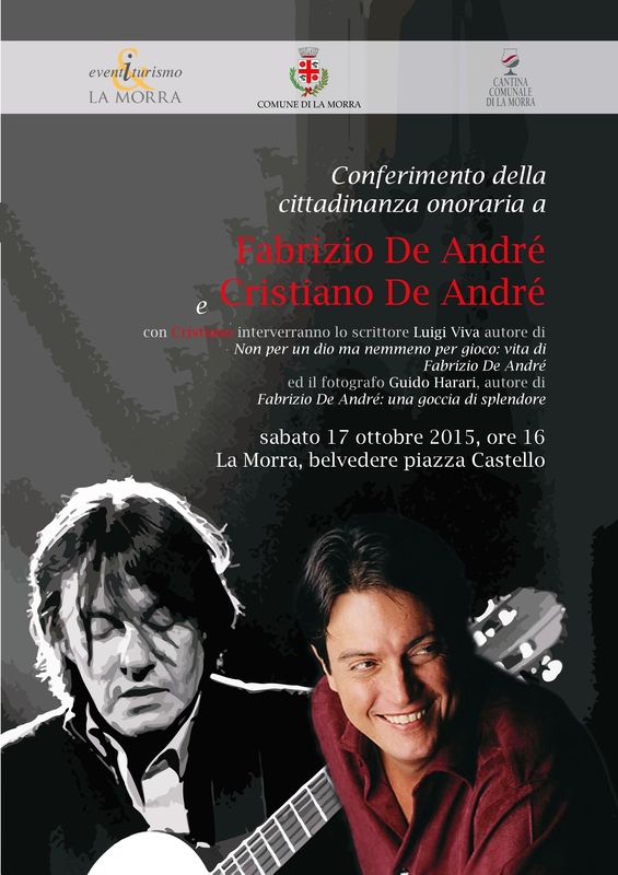 LA MORRA È ufficiale, Cristiano De Andrè sarà a La Morra sabato 17 ottobre. Cristiano De Andrè è uno dei migliori cantautori e polimusicisti italiani. Nato a Genova, nel dicembre del 1962, è figlio di Fabrizio De Andrè, grandissimo cantautore italiano che proprio a La Morra nel 1954 ricevette in dono la sua prima chitarra. L’appuntamento è fissato per le 16 in piazza del Belvedere dove verrà conferita a lui e al padre Fabrizio De Andrè la cittadinanza onoraria.